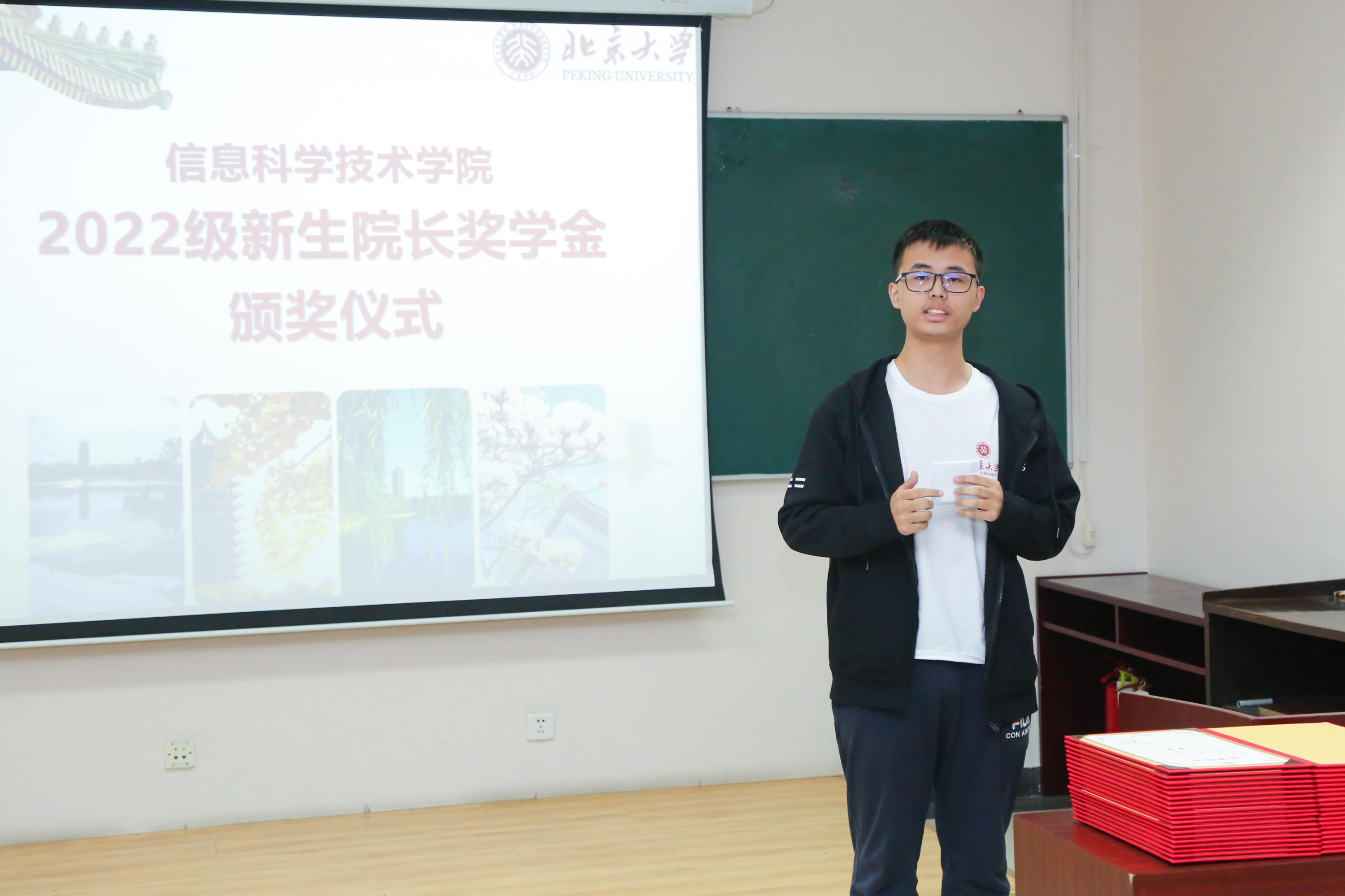 曾获得国际信息学奥赛金牌的钱易同学作为获奖学生代表发言。他说,非常荣幸能够获得新生院长奖学金一等奖,这是对我未来学习生活的一种激励。在学习过程中深深感受到基础知识的重要性,信息学竞赛中所包含的知识也只是计算机科学中的冰山一角,“工欲善其事,必先利其器"。钱易同学表示,在未来的大学学习生活中一定会加倍努力,取得更好成绩,为以后的科学研究打下坚实的基础。