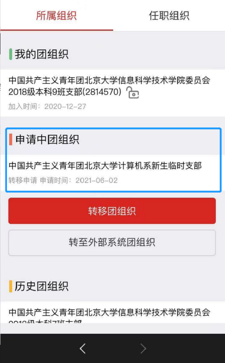 7.可通过上述流程1-3步进入“我的组织”页面,查看转移状态。当“我的团组织”显示为新生临时支部时,即为转移流程全部完成。