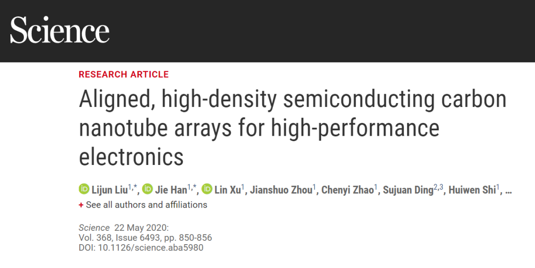 在碳纳米管电子器件和集成电路方面取得了一系列重要成果,特别是高密度高纯半导体碳管阵列的制备和其在电子学应用的展示,突破了碳基电子学的实用化的瓶颈问题,代表了本领域的重大突破。他所在的张志勇教授-彭练矛教授课题组发展全新的提纯和自组装方法,制备高密度高纯半导体阵列碳纳米管材料,并在此基础上首次实现了性能超越同等栅长硅基CMOS技术的晶体管和电路,展现出碳管电子学的优势。这一成果,将为碳基半导体进入规模工业化奠定基础,也为我国芯片制造产业实现“弯道超车”提供巨大潜力。相关研究成果以《用于高性能电子学的高密度半导体碳纳米管平行阵列》为题,2020年5月22日在线发表于《科学》(Science,第368卷6493期850~856页)。刘力俊和北京元芯碳基集成电路研究院工程师韩杰为并列第一作者,张志勇和彭练矛为共同通讯作者。