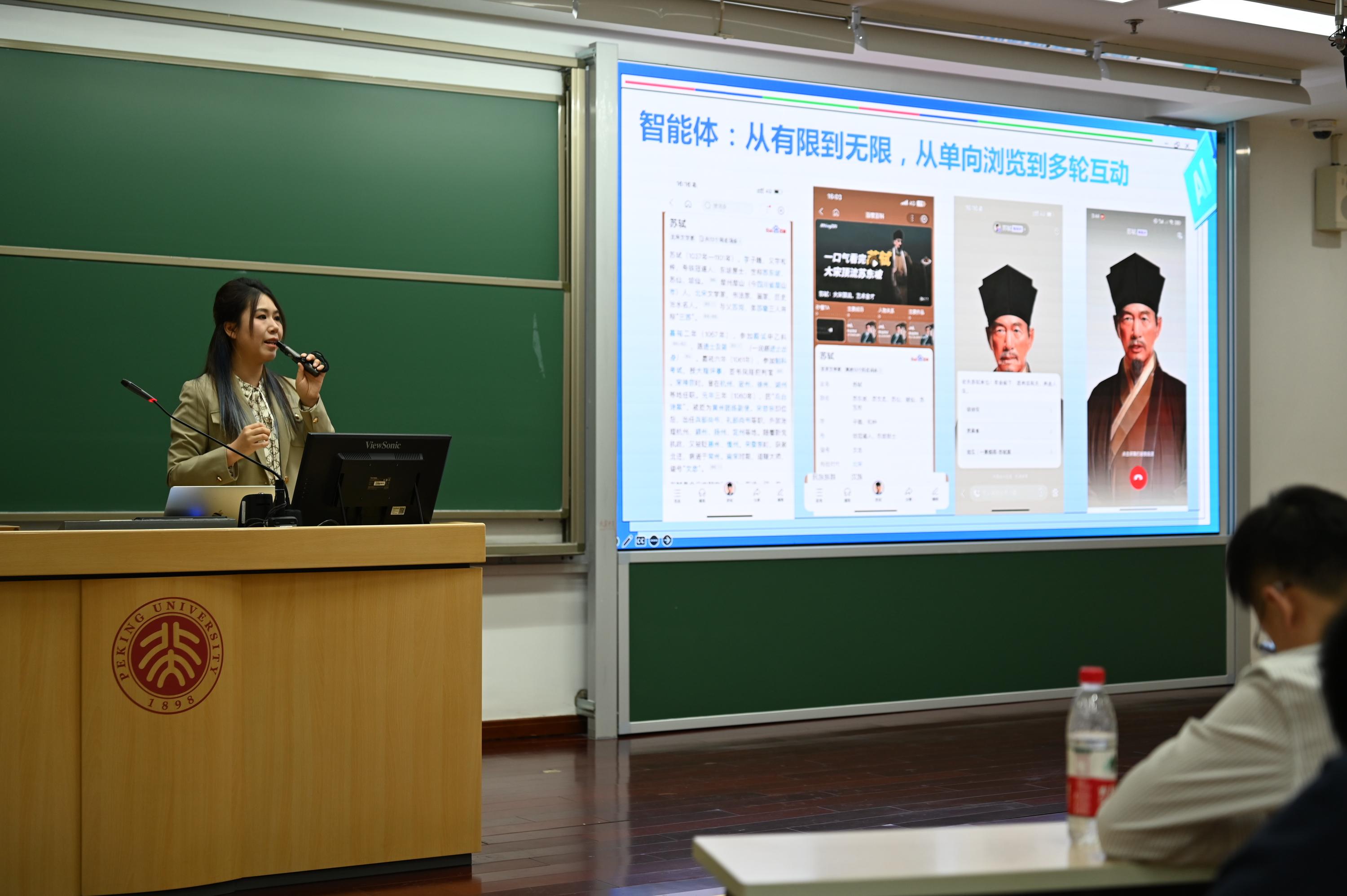 讲座的第三部分主要围绕百科为什么要做智能体展开。容薇女士首先为同学们展示了从古至今知识载体的演进:结绳——甲骨文——竹简——纸张——网页——视频——智能体,表明了智能体是在用户习惯和知识载体发展推动下的一个必然趋势。紧接着容薇女士向同学们展示了百度智能体的特点,包括PGC+UGC,协同构建知识共同体、图文——视频,产出多元内容形态,有用/有趣的科普短视频、交互形式:XR沉浸式交互(巴黎圣母院全景实拍、VR复原西南联大等)等等。之后容薇女士又为同学们介绍了一些有趣的智能体如苏轼智能体、秦始皇智能体、李清照智能体等历史人物智能体以及易秩律师智能体、京剧智能体等等,使同学们真切感受到了智能体从有限到无限的潜力以及从单向浏览到多轮互动的发展趋势。