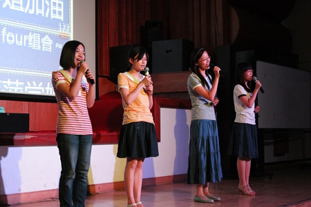 于是我们就欢乐地决定以“四小学姐”组合参赛了。其实对于四个不太会唱歌的人,这次比赛无疑是一个巨大的挑战。我们花了一下午的时间从歌单中精心筛选,最后选择了《原来你也在这里》,缓缓流过的旋律,安静倾诉的感情。四年的室友情,一路走来,原来你也在这里。