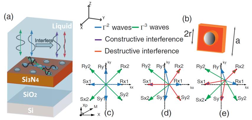 图1 (a)观测到非Gamma点可调谐束缚态的光子晶体平板结构;(b) 基本格子;(c)-(e)不同面内波矢情况下的相位匹配条件