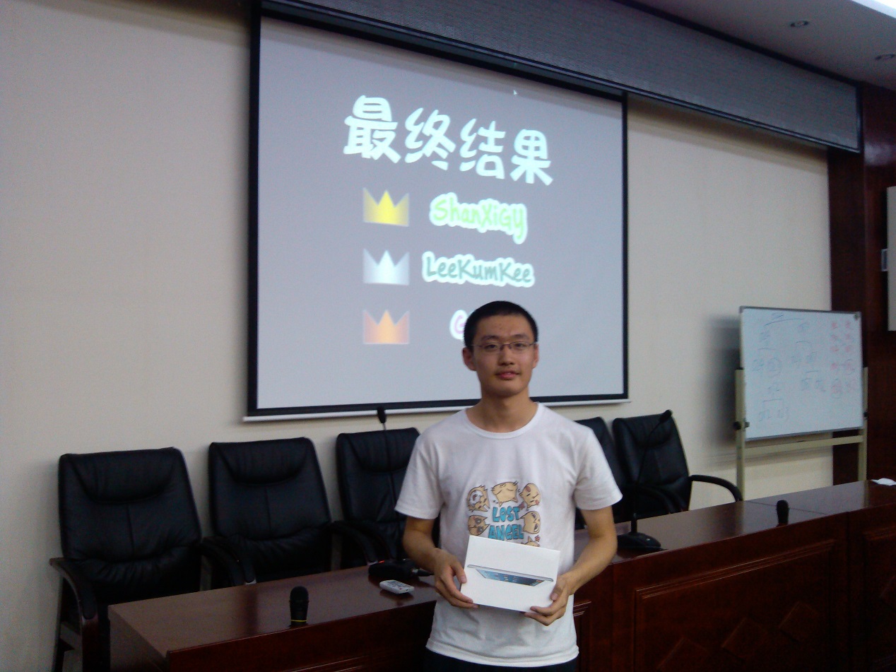 大一同学关宇、杜宇飞分别获得了冠、亚军,李旭鹏、贺心蕊、史默臻三人队伍获得了季军。比赛结束后进行了颁奖仪式,为各获奖队伍颁发了精美奖品。至此,第五届av漫画