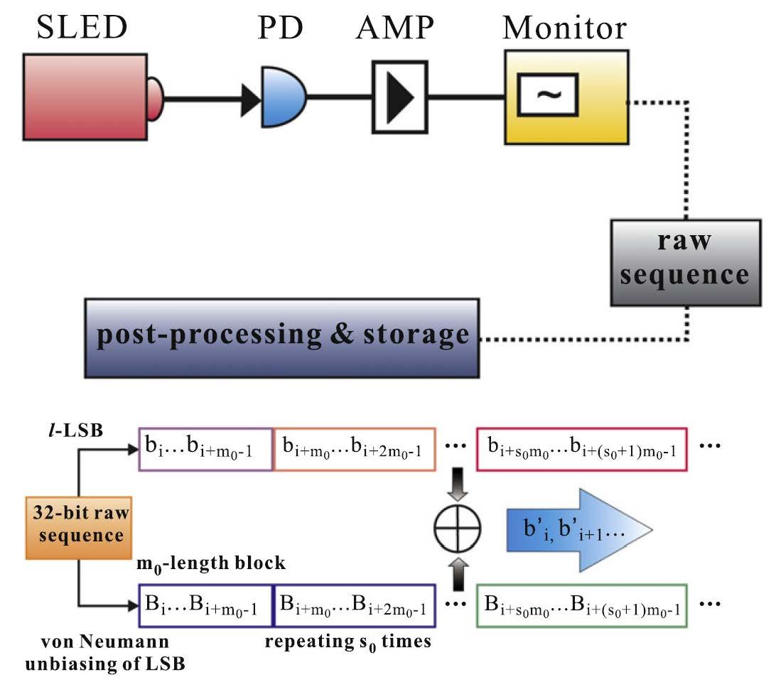 近期,郭弘课题组已在真随机数发生器研究领取得了一系列研究成果。例如,通过对离散型和连续型量子随机源的持续研究,在随机源的建模分析、信号采集手段、数据后处理方法和随机性统计检测等方面均形成理论和技术的积累。经过不断探索新型超大带宽量子光源,课题组发现超亮发光二极管在噪声的量子不确定性和探测技术易实现性方面都有良好的性能;结合快速采样技术和新型数据后处理方法,实现了速率达到1012bit/s的超高速真随机数序列的产生。研究成果通过了国际标准统计检验包和自主设计的创新型统计检验包,在国际真随机数发生器领域创造了一个纪录。