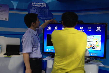 微处理器研发中心的云电视参加了本次科技展。云电视产品是面向三网/4C融合应用领域,以北大众志自主CPU为核心的新一代信息终端。采用北大众志自主创新的CPU产品,单芯片集成了传统计算机的全部功能(用于集散功能的1.5GHz主频CPU、用于2D/3D图形处理的1.0GHz主频GPU、全格式视频编解码处理的VPU和计算机南桥/北桥设备控制的完整模块),通过与国内软件厂商的电视业务服务商的合作,操作系统和应用软件也实现了国产化。充分体现了数字信息终端产品“以计算机技术为平台、以通信技术为纽带、以消费类电子为产品形态”的发展趋势。