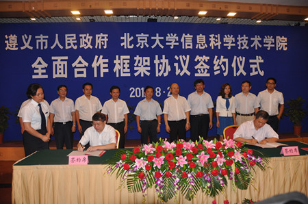 以及信息学院的基本概况,并表示学校非常重视信息学院与遵义市人民政府的全面合作。杨秘书长指出,遵义正着力提升“转折之城”、倾力打造“会议之都”,是贵州经济社会发展的新增长极,其信息化建设与发展显得尤为重要。此次院地合作协议的签署是北大服务遵义、服务西部的重要战略,是具体落实国发〔2012〕2号文件精神,支持遵义走后发赶超之路的重要举措。学校将支持信息学院各项产业发展,也希望双方以此次合作协议签订为契机,进一步加强沟通交流,深化合作关系,落实好双方协议内容,尽早建立以政府为引导、企业为主体、高校为依托的产学研政协同创新模式。
