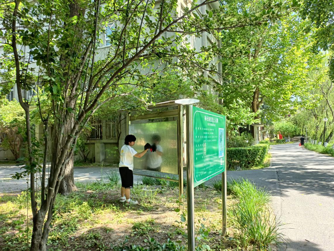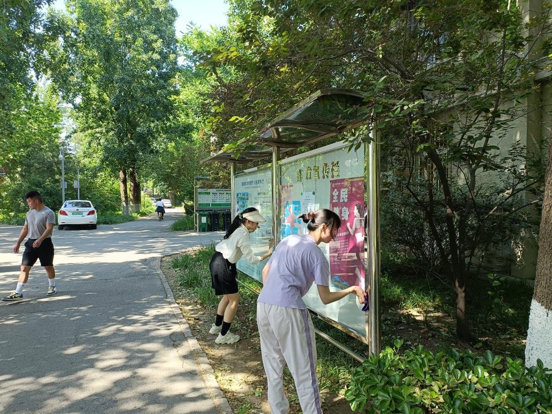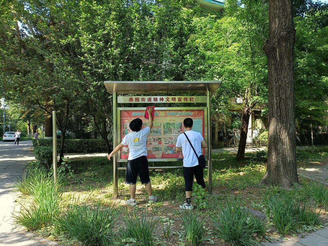 同学们的任务主要分为两部分,一部分同学负责清洁社区公告栏、宣传栏以及社区公共基础设施,另一部分同学负责清理路面、湖边以及草丛中的垃圾。天气十分炎热,但同学们劳动的热情都十分高涨。