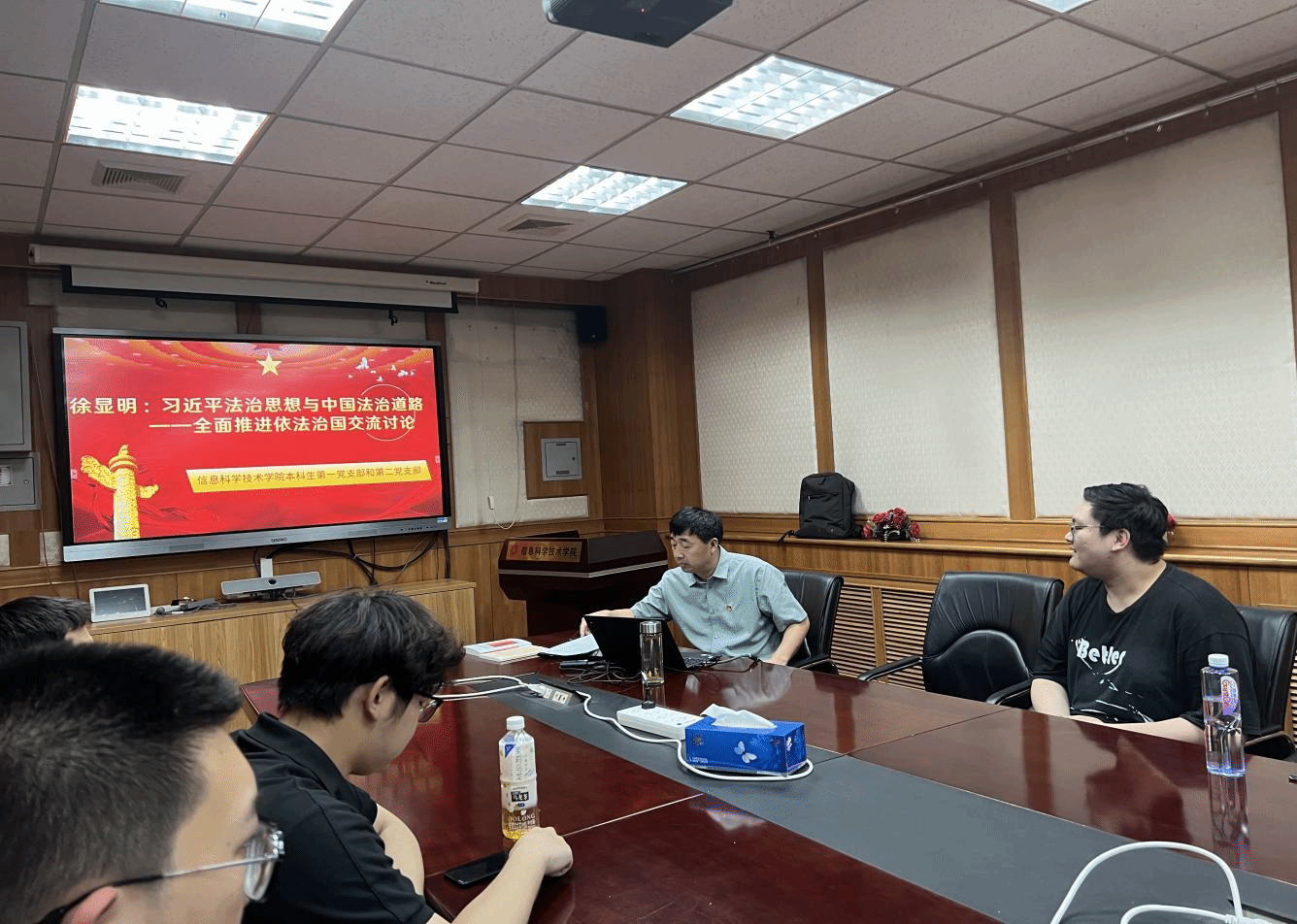 首先,党委书记严敏杰带领党员,共同回忆了徐显明“习近平法治思想与中国法治道路”专题党课的学习内容,分享交流学习感想。党员们纷纷表示,讲座从理论、历史、实践,全方面梳理习近平法治思想与中国法治道路相结合的发展脉络,深刻阐释了习近平法治思想内涵和时代意义。严敏杰对党员们专题党课的学习成果给予充分的肯定,讲座主题鲜明,内容深入浅出,紧扣时代脉络,通过深入学习贯彻习近平法治思想,大学生党员要坚定不移走中国法治道路,全面推进依法治国建设。