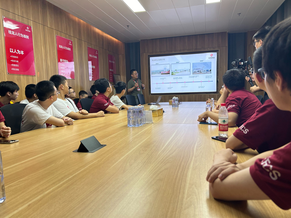 随后,同学们来到桂龙药业进行参观学习。负责人在介绍中说道:企业专注于中成药的研发、生产和销售,在国内的该领域处于领先地位,体现了持续的创新能力。此外,他补充道:公司起初是外资控制,通过收购转型为本土企业,这一变革标志着自主创新和本土化管理的重要进步,让桂龙药业更好地适应国内市场,展示了中国企业在全球化中自我突破和成长的决心。