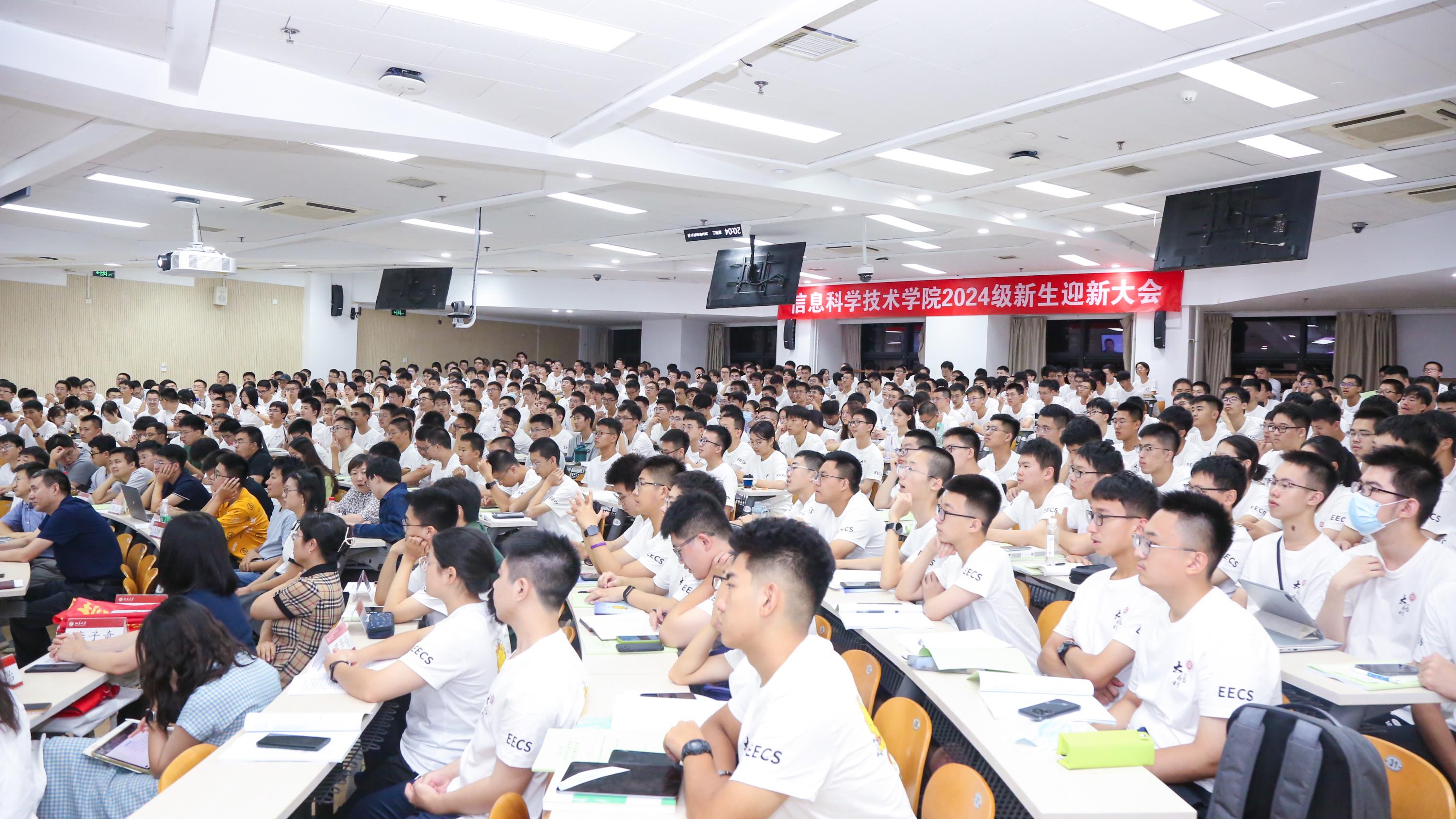 2024级新生迎新大会在理科教学楼108教室举行。学院党委书记严敏杰,院长侯士敏,副院长陆俊林、王润声、邓斌,党委副书记贾方健,2024级10班第二班主任、校团委研究生与青年工作部部长杨森,以及学院教务、学工相关部门老师,2024级各班班主任和带班辅导员,老生代表以及2024级全体新生参加大会。会议由学院2024级年级辅导员付晓倩主持。