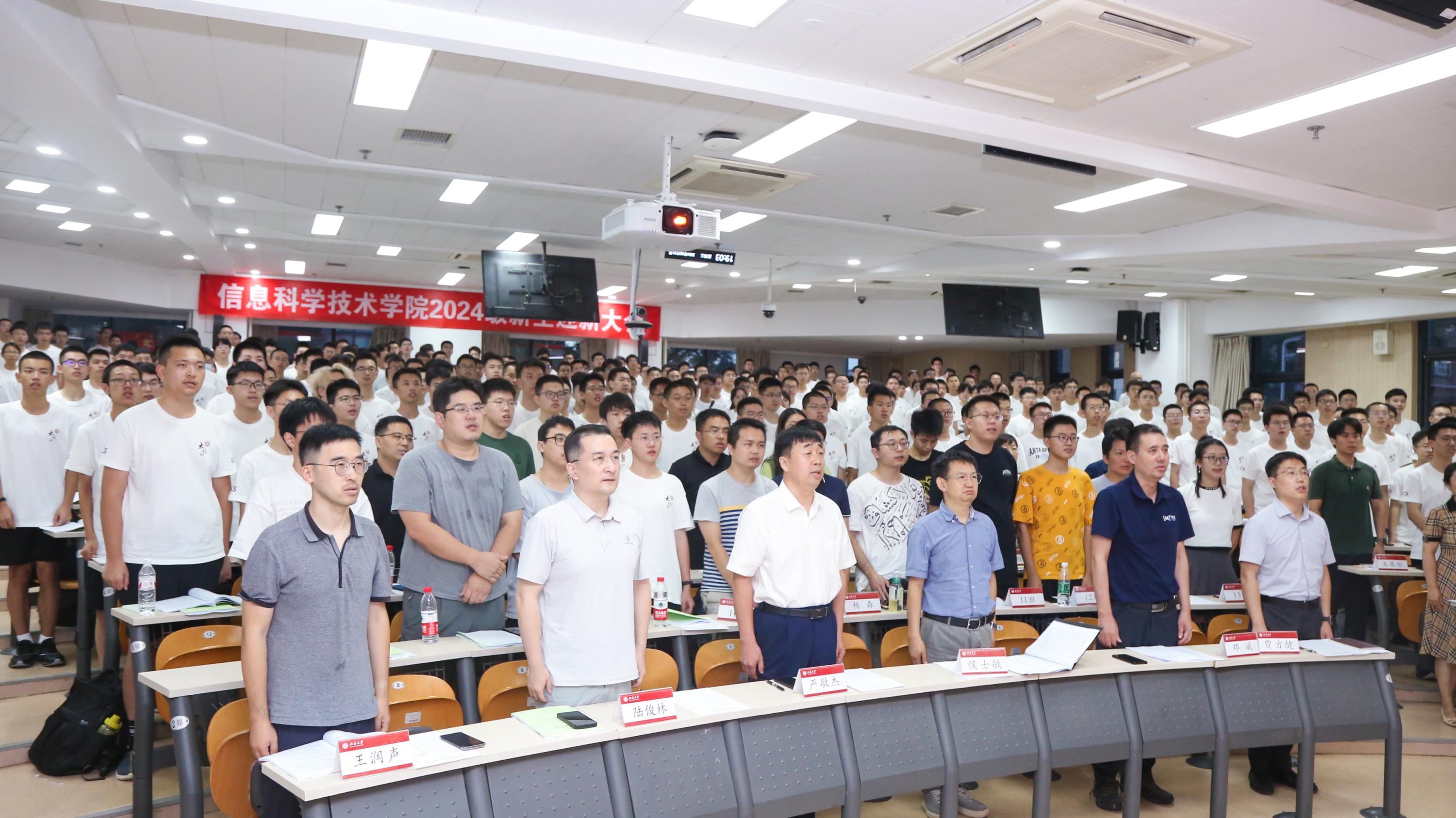 在激昂雄壮的国歌声中,迎新大会缓缓拉开帷幕。