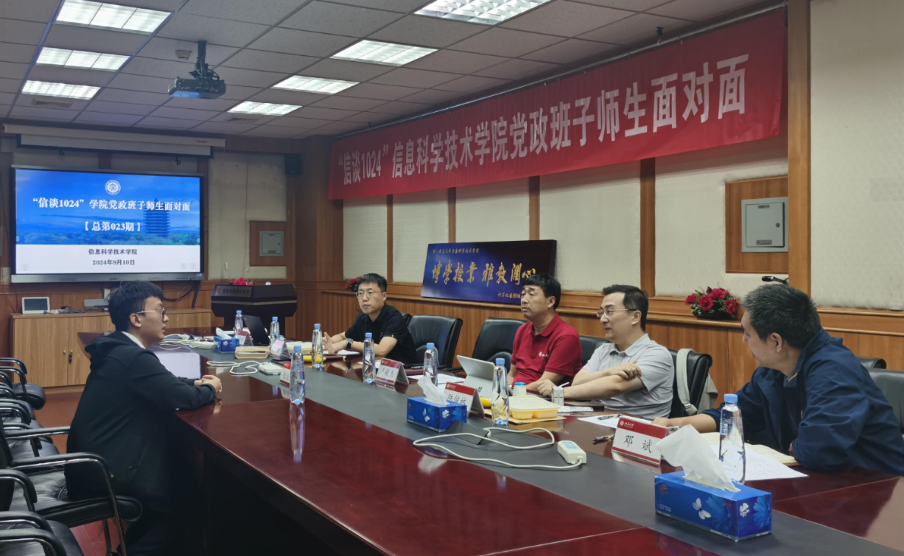 在理科二号楼2111会议室举办2024-2025学年秋季学期首场(总第二十三期)“信谈1024”学院党政班子师生面对面座谈会,聚焦学科质量、服务学生成长,对新同学新学期的新问题全面答疑解惑。学院党委书记严敏杰,院长侯士敏,副院长陆俊林、邓斌,党委副书记贾方健,成功报名的九位学生依次参加了本次单独面谈。活动由学院学工办主任李子奇主持。