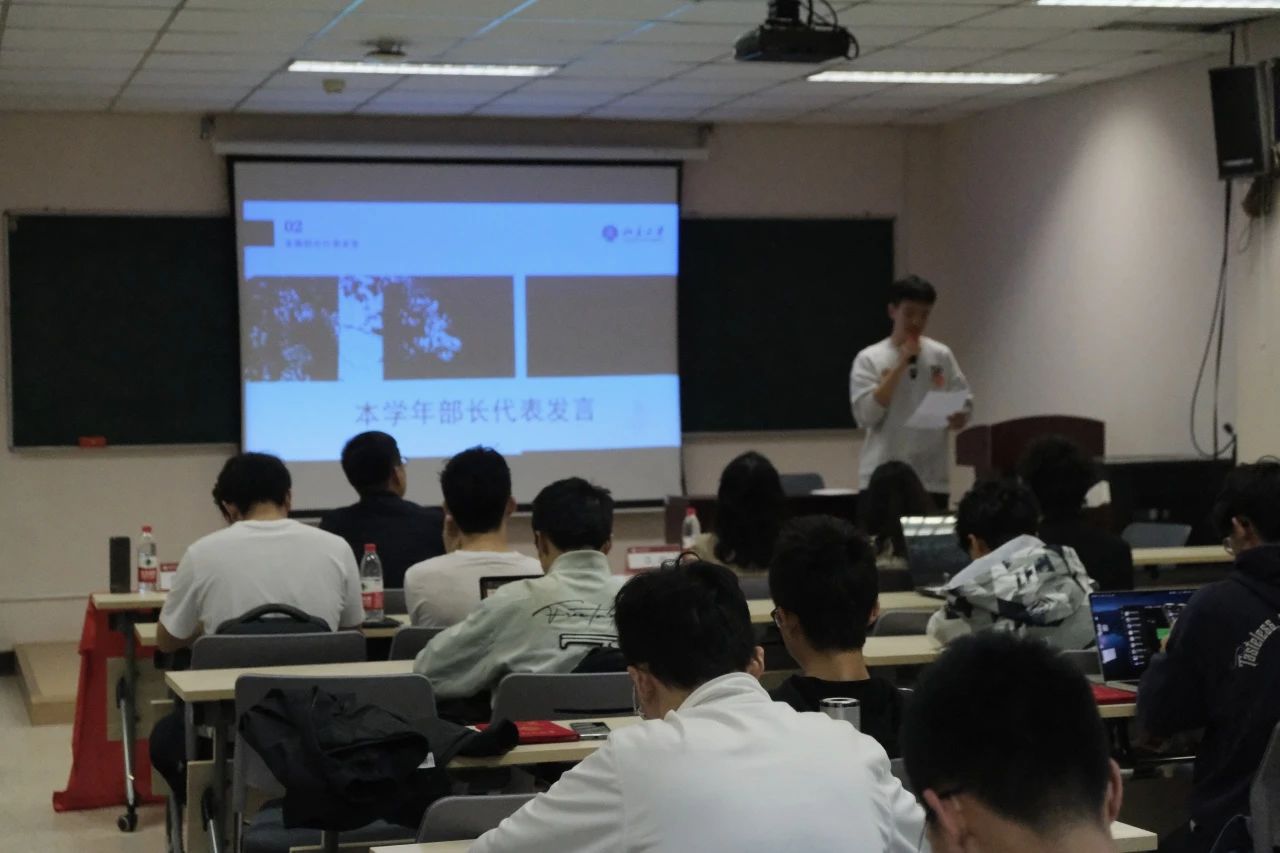 随后,加玉翔同学作为上一学年的部门负责人代表进行发言。他分享了过去一年在学院团委工作的感受和体悟,并从如何传承办好老活动、创新开展新活动等多个方面对工作经验进行了全面的总结。他也鼓励各部门新上任的负责人能在前辈总结上得到一点经验和方法,从而做得更好。