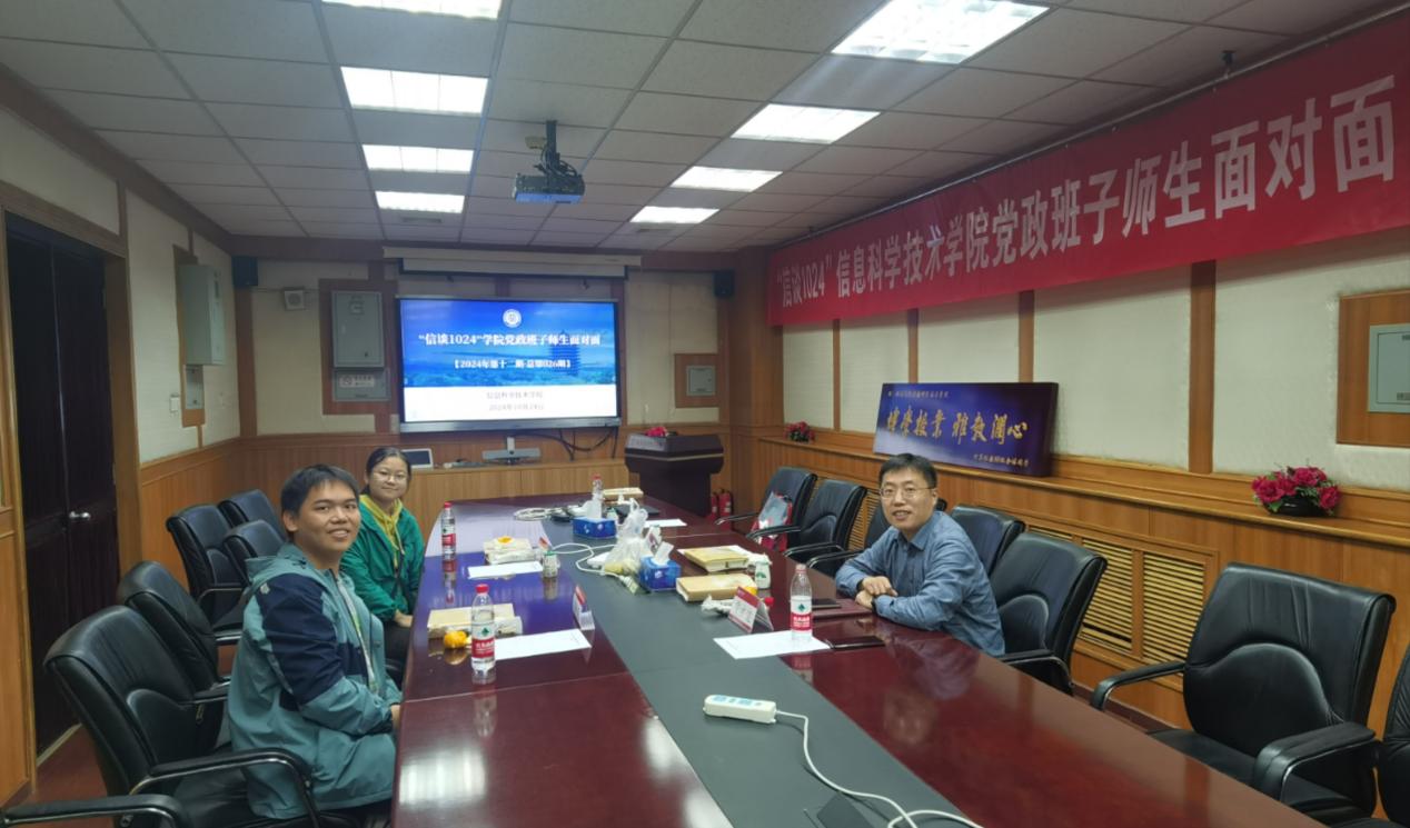 在理科二号楼2111会议室举办2024年第十二期(总第26期)“信谈1024”学院党政班子师生面对面之港澳台及留学生专题活动,本次座谈会采取群体座谈的形式,对报名同学们的问题进行全面交流答疑解惑。学院教学副院长陆俊林、党委副书记贾方健,成功报名的学生代表们参加了本次座谈。活动由学院学工办主任李子奇主持。