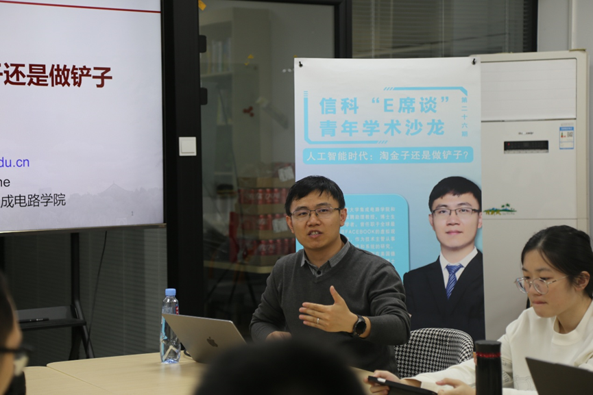人工智能研究院和集成电路学院双聘助理教授、博士生导师、博雅青年学者李萌老师受邀进行了以“人工智能时代:淘金子还是做铲子”为主题的分享。学院团委书记吕媛老师参加了本次活动,本次沙龙由信科青年志愿者协会翟睿辰同学主持。