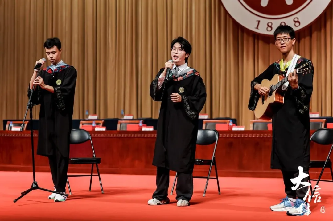 典礼正式开始前,毕业生代表表演了精彩的文艺节目。梁永健、张泽彬、秦昊三位同学的弹唱《光阴的故事》,施宸皓同学的独唱《我们的告别信》,郭子昂、桑钰超、王子健和朱文昊四位同学的合唱《青春大概》,充分展示了同学们青春的活力、青春的感动、青春的记忆。