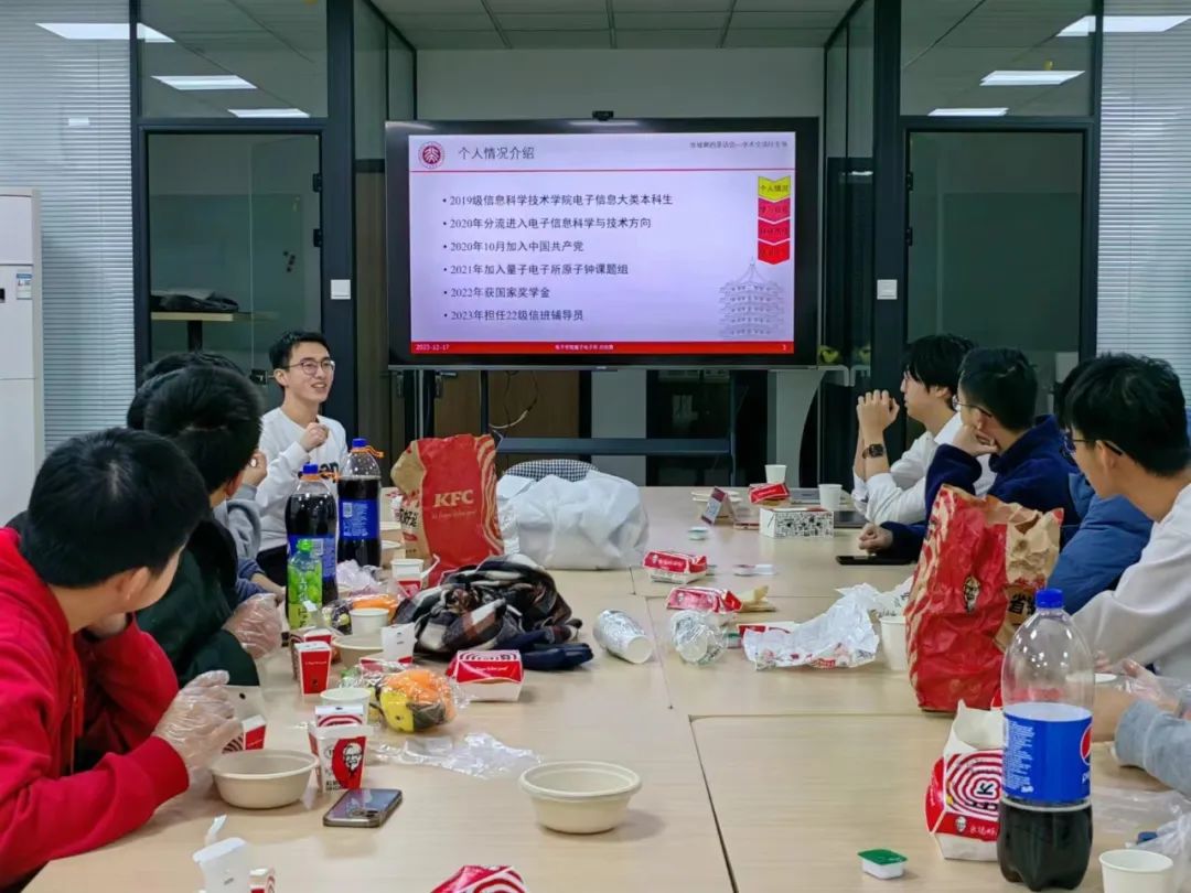 随后吕杭哲简要介绍了电子学院部分研究方向,例如量子电子所主要研究量子频标、时频传感、量子传感等课题,信息与通信所主要研究光纤通信和无线通信等。谈及本科生科研训练项目,吕杭哲首先向同学们展示了本研时间线,使同学们对于该项目有了较为直观的了解。此外,他建议同学们从个人兴趣、科研能力、文章产出、毕业与就业情况等角度综合考量后选择最适合自己的研究方向。交流最后,吕杭哲介绍了入党流程以及党支部丰富多彩的活动。