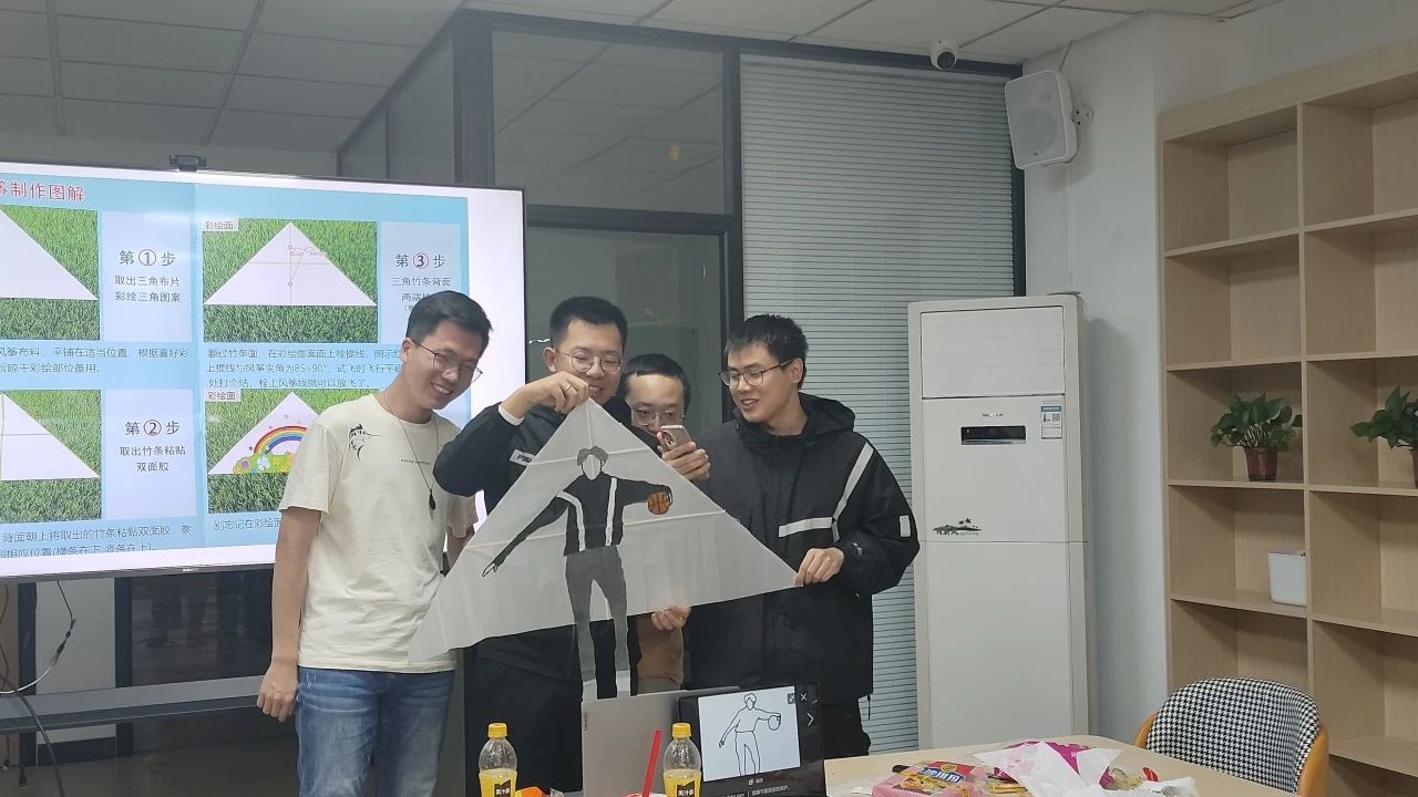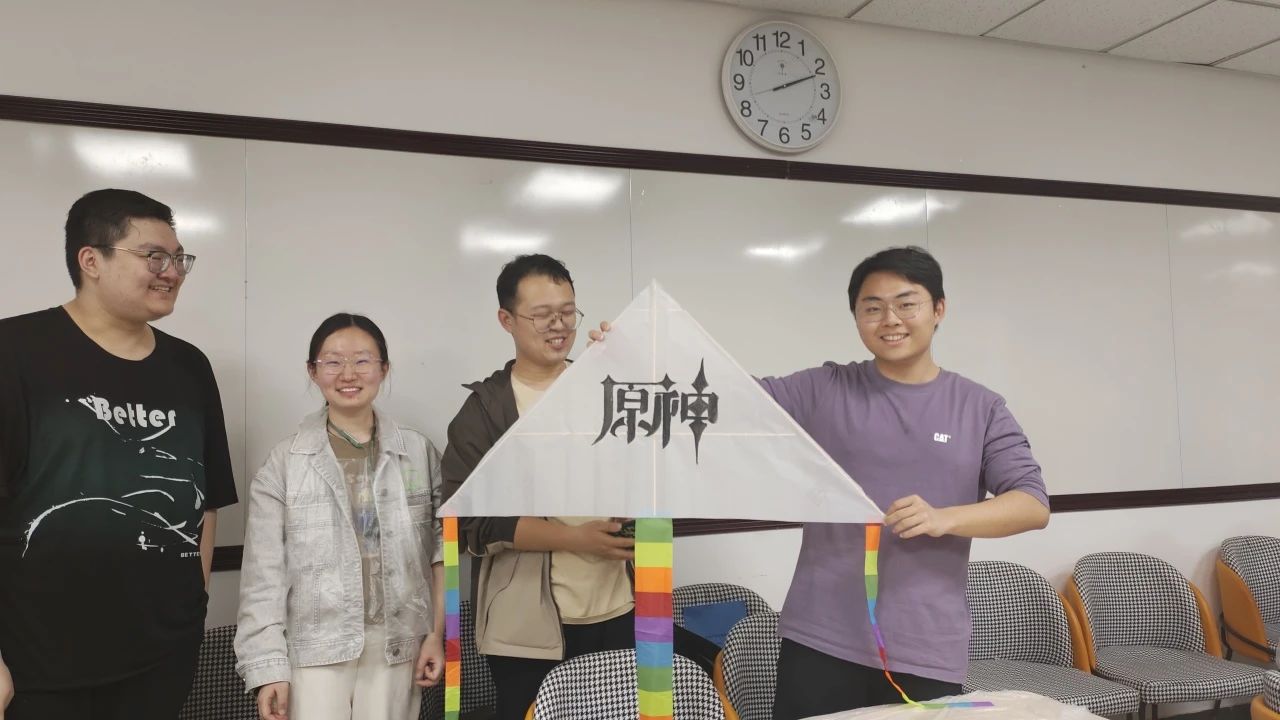 4月6日下午13:00,1127教室已经布置完成,支部成员陆续到来,活动正式开始。活动共分为两个环节:做风筝和保研经验分享。首先,支部成员分为六个小组,分别使用提供的DIY材料包,设计并制作一只风筝。材料包含空白风筝布、木条、风筝线、颜料及各种手作工具,提供了充足的设计空间,各组同学展现出了出色的创作能力和优秀的团队合作精神,八仙过海,各显神通,创意频出,气氛热烈。第一小组绘制了四格简笔画,简单的笔触勾勒出可爱的图案,放在一起莫名的可爱和谐;第二小组巧妙地融入热梗于风筝制作当中,逗得众人捧腹大笑;第三小组绘制了喜欢的游戏logo,简洁有趣;第四小组则将专业知识和风筝制作完美结合,飞机形制加上MOSFET的基本结构,表达了对祖国芯片行业一飞冲天的美好祝愿;第五小组充分利用了所有风筝布,一棵松树上绘满了可爱的图案;第六小组则以精巧的外形设计和或门寄托的寓意赢得了众人的赞叹。通过民主投票,第二小组获得了“最佳创意奖”,小组成员都得到了一只熊猫玩偶和一个精美的钥匙扣作为奖品,其余每个小组也都获得了一只熊猫玩偶。