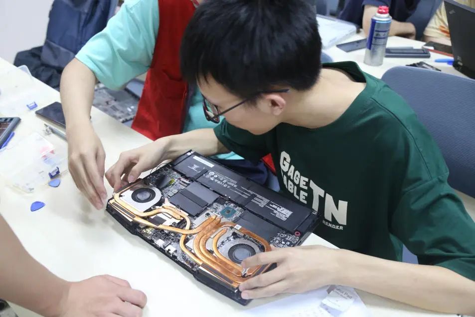 下午2:50讲座结束,本次活动的电脑维修开始了,志愿者们领取维修物资:螺丝刀、翘片、收纳盒、酒精棉片等。大家各自接单,耐心解决客户的清灰、换硅脂、清理内存等电脑问题。志愿者们也都互相帮助,热心解答客户们提出的一些有关电脑基础知识和电脑故障的问题,让参加活动的同学电脑知识都有所提高。维修中志愿者们遇到了一些难以处理的问题,大家通过现场学习、细心琢磨把它们逐一攻克。活动后,同学们都对此次服务表示满意。