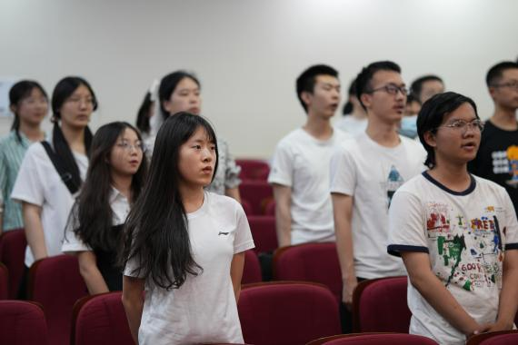 老师学员们全体起立,热情洋溢地唱响中国共青团团歌。伴着五月花海的歌声,同学们洋溢的青春热情和风采被淋漓尽致地展示出来。