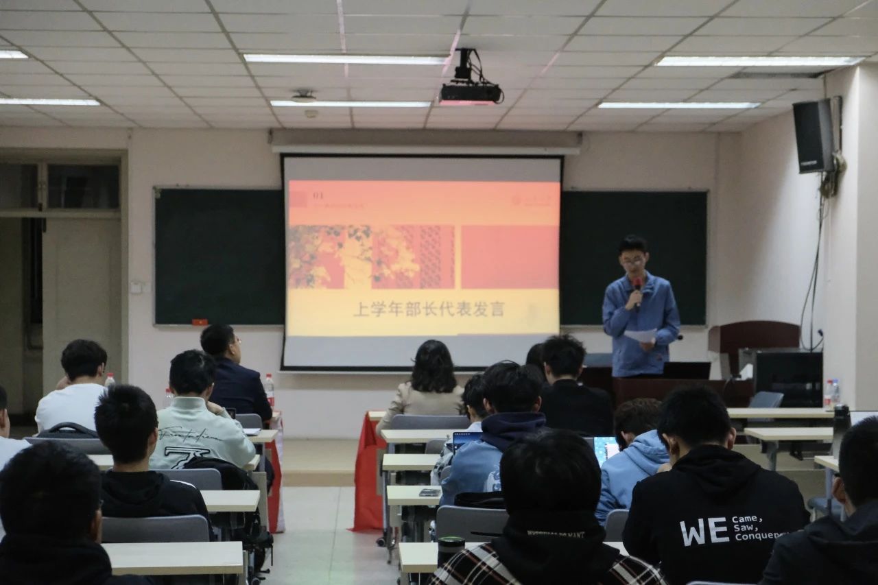 随后,加玉翔同学作为上一学年的部门负责人代表进行发言。他分享了过去一年在学院团委工作的感受和体悟,并从如何传承办好老活动、创新开展新活动等多个方面对工作经验进行了全面的总结。他也鼓励各部门新上任的负责人能在前辈总结上得到一点经验和方法,从而做得更好。