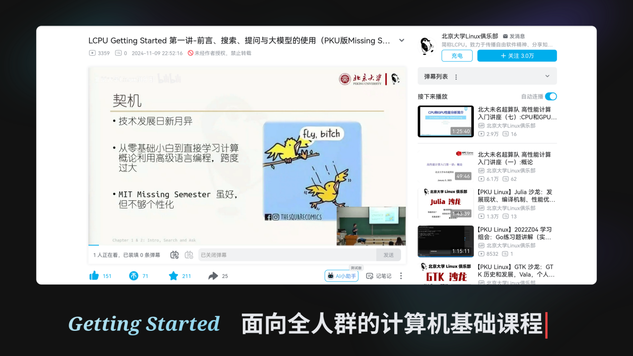 社团也致力于为不同水平、不同专业的同学提供学习、交流与实践的平台。“Getting Started” 课程,面向全校同学,致力于补充校内课程涉及甚少、但对科研实践至关重要的知识,不仅线下氛围火热,活动在线上也收获了极大关注,回放10天内收获2000+完整播放,社团的b站账号已有超过3万粉丝;对于有一定基础的同学,“Rust 学习小组”等活动为他们提供深入学习前沿领域的机会,有助于培养多元化知识结构与创新能力。