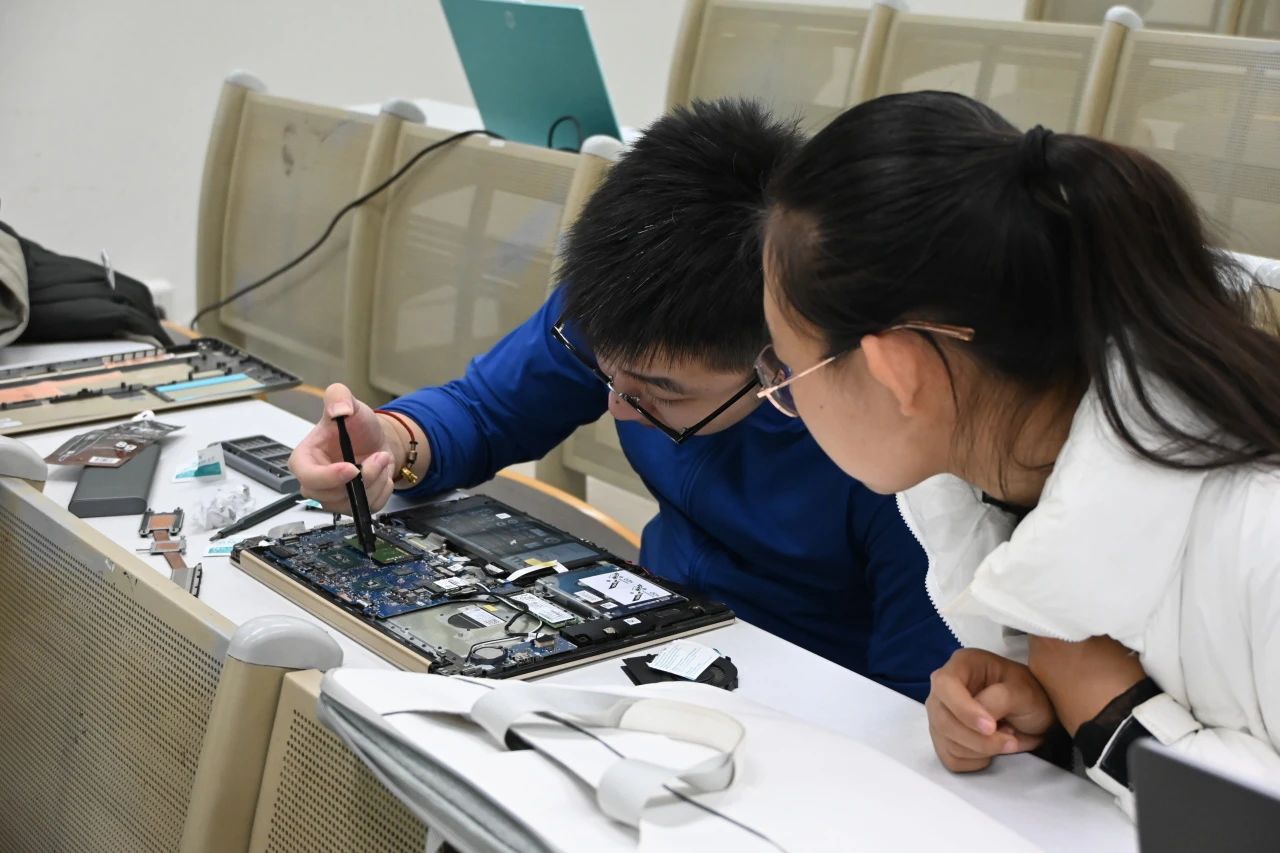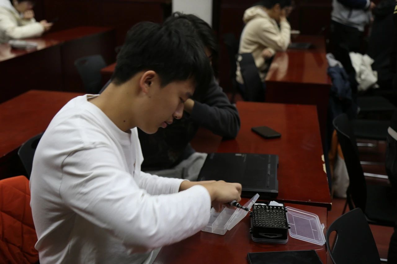10点,讲座结束,燕园志愿者们在1131教室热火朝天地行动起来。同学们扫码签到,志愿者通过小程序浏览问题,有序接单,拿取螺丝刀、酒精棉片等物资并开展维修。面对各种电脑问题,大家“软”“硬”兼施,标本兼治,团结协作,精准排障,有效解决了拆机清灰、硅脂更换、空间清理和系统重装等多种问题,使多数参加活动的同学能够满意而归。对于同学们提出的有关电脑基础知识及常见故障的问题,志愿者们也都一一耐心回答。